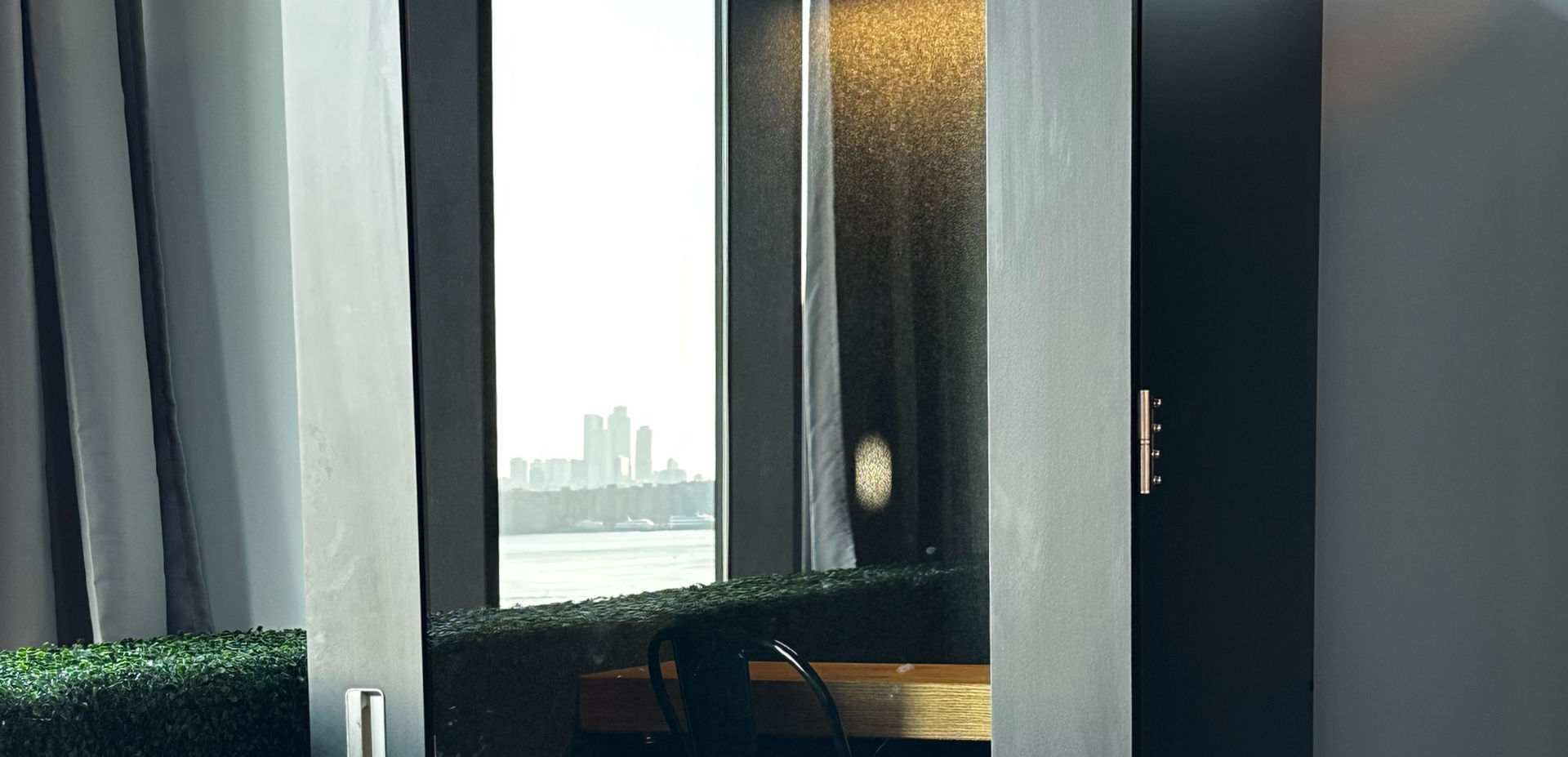 Spanning 1,000 square feet with corner views overlooking the Intrepid, the space blends lounge seating and work tables, with two MEAVO meeting booths providing privacy when needed.